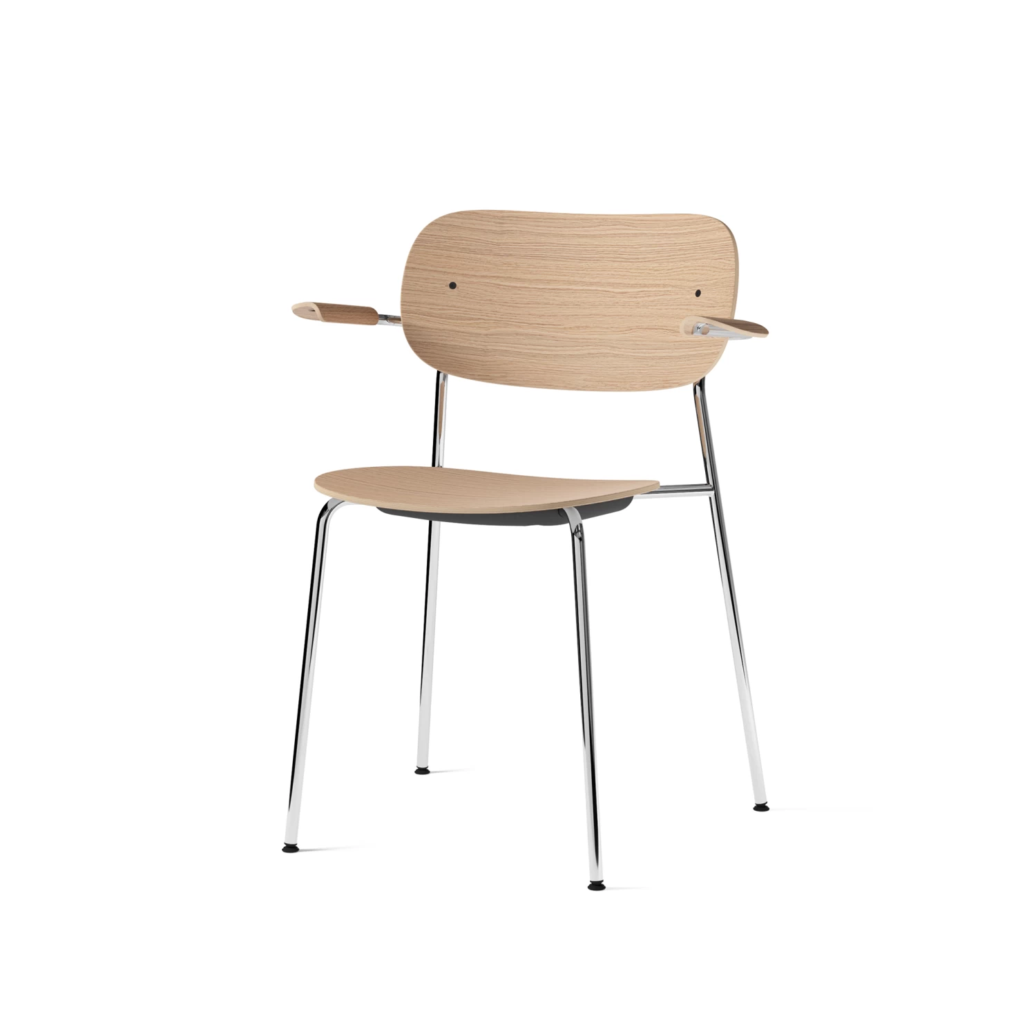 The Co Chair is crafted from form-pressed veneer in three different finishes and a steel frame which can be chromed or powder-coated in black. Available un-upholstered here for a minimal look.