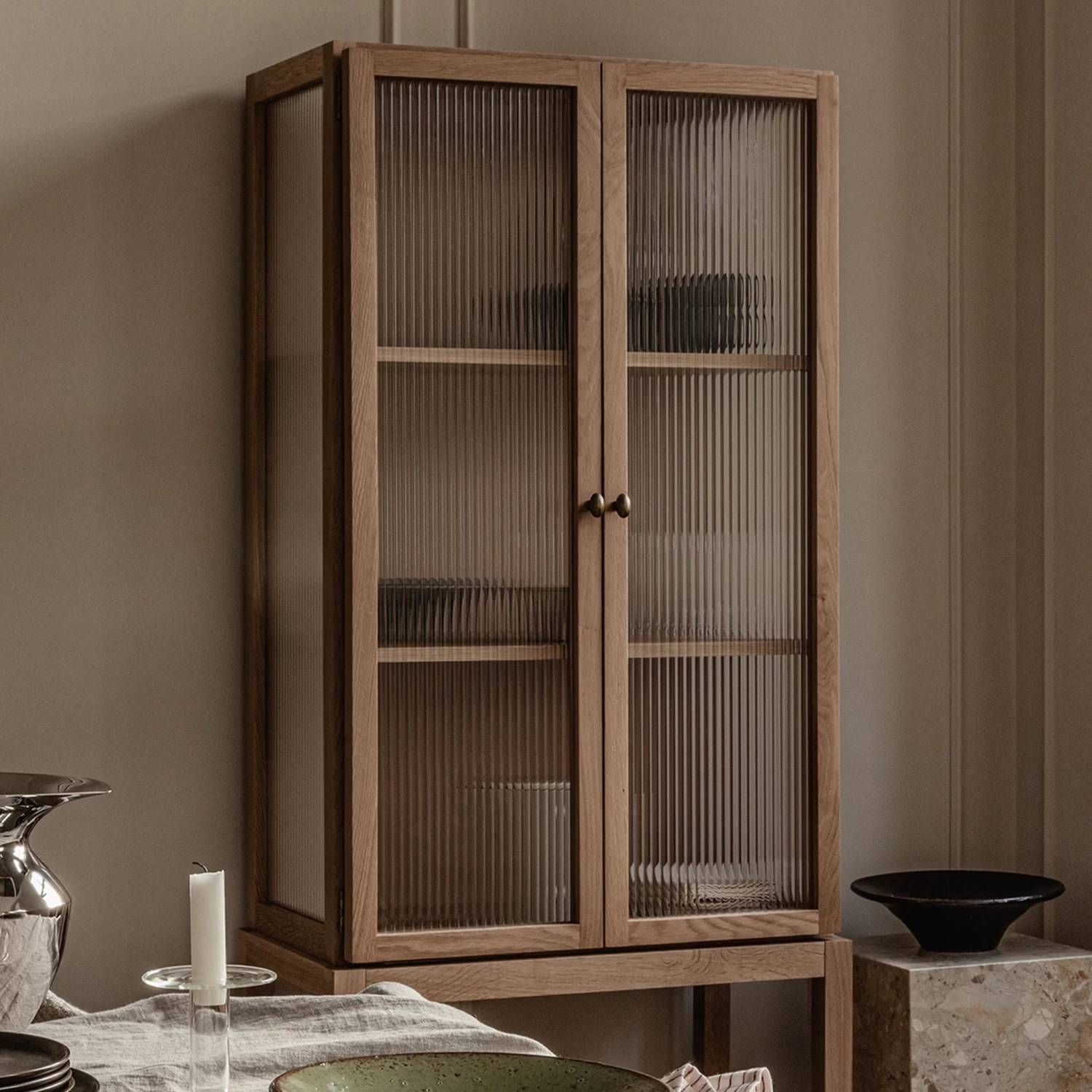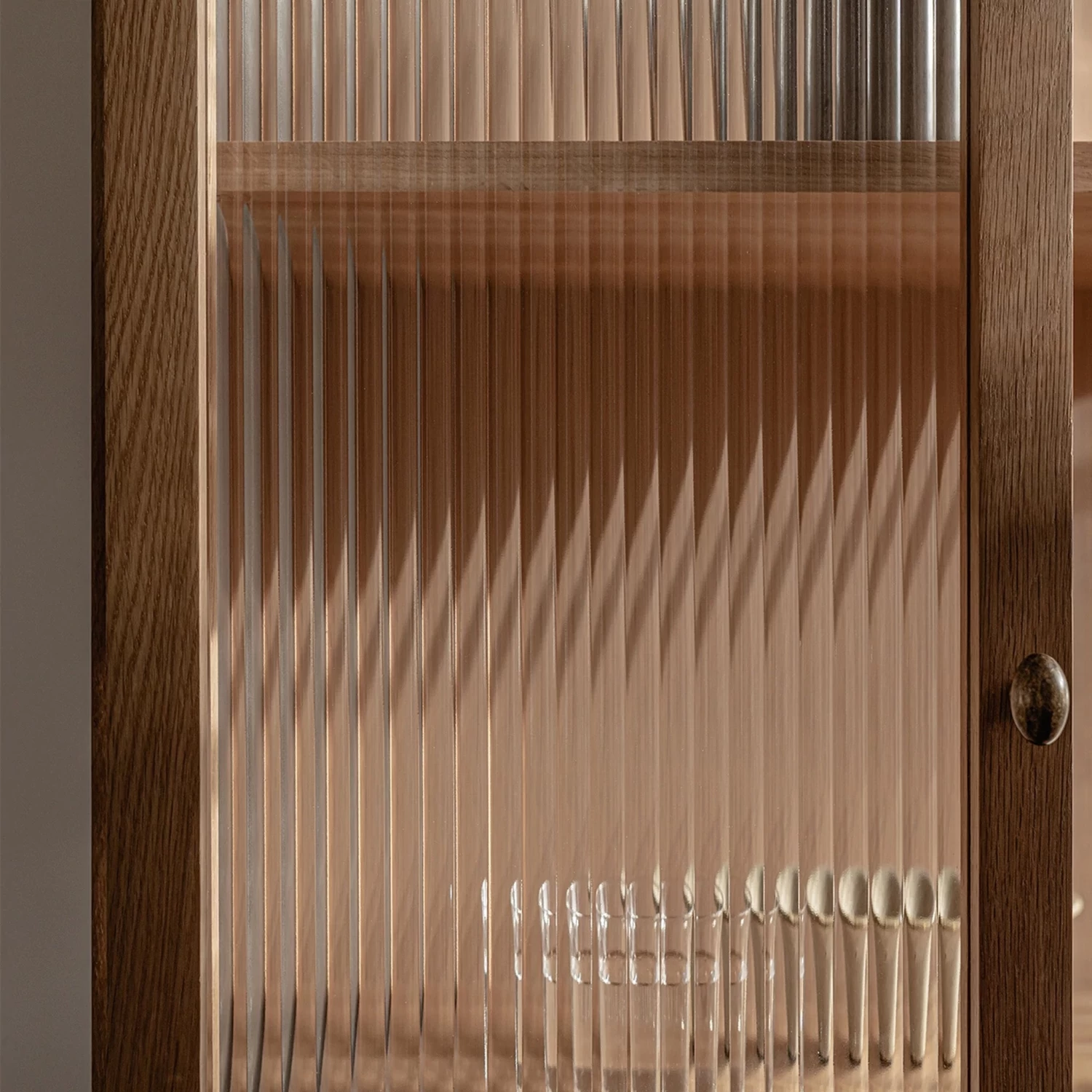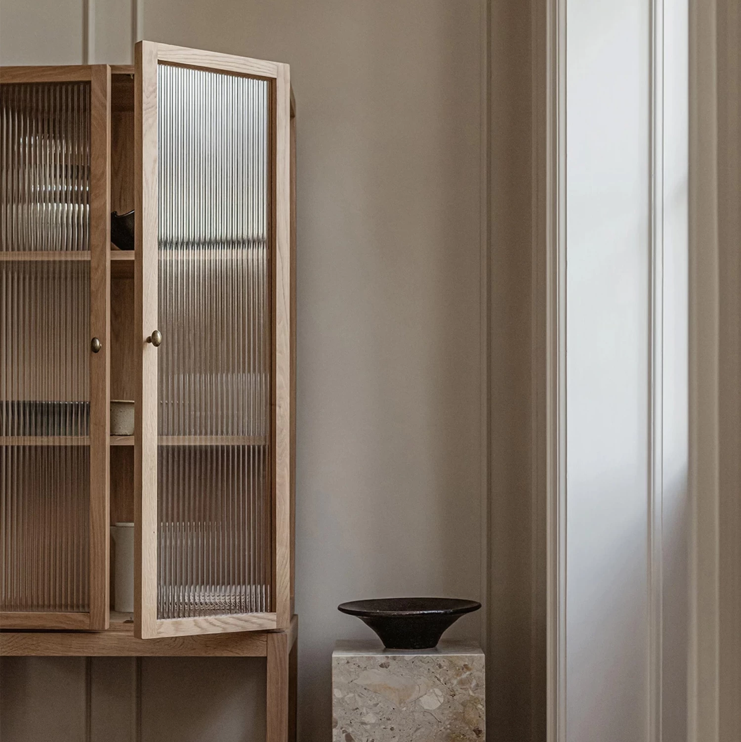 A cabinet to store special objects almost out of sight, the Curiosity Cabinet features reeded glass on three sides that gracefully blur what’s stored inside.