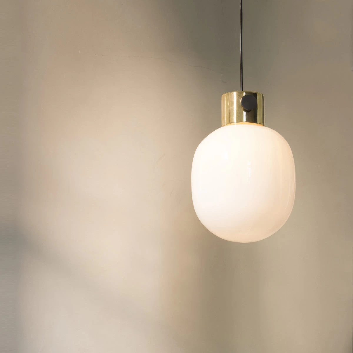 Base in polished brass or brushed steel. The brass version is mirror polished but not lacquered so the metal will darken and develope a patina over time. The glass shade is made from mouth-blown opal glass. The knobs are bronzed brass and oxidized steel.
