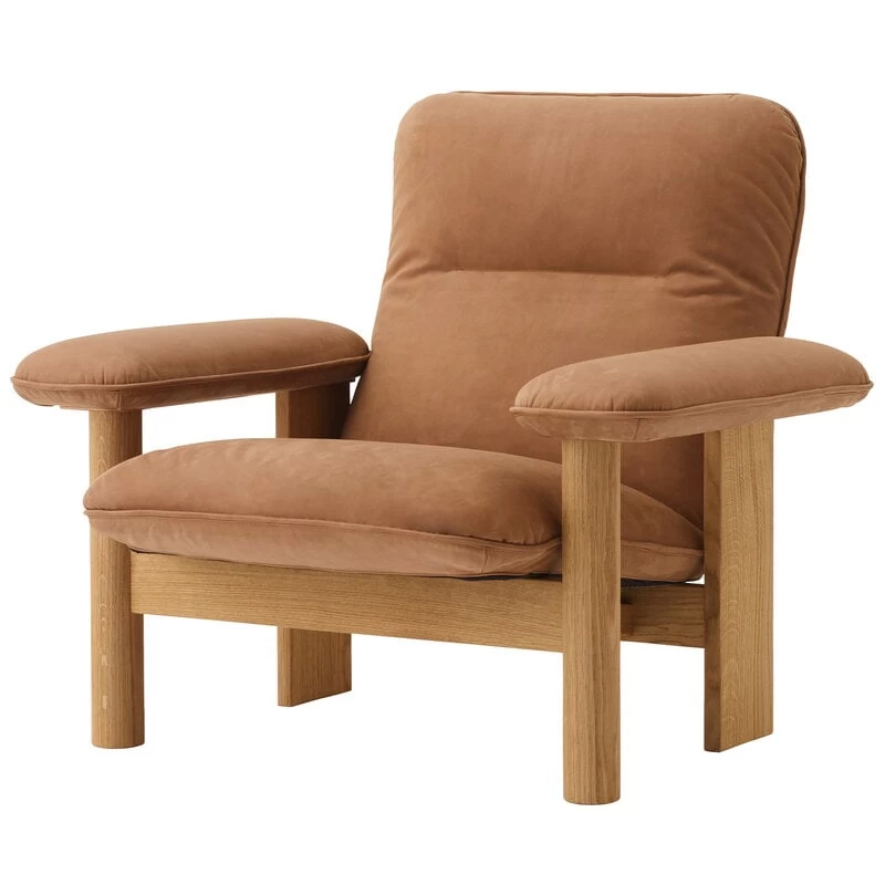 Menu’s Brasilia lounge chair delights with its organic feel and soft lines. Designed by Anderssen & Voll, the Brasilia lounge chair features a solid wood frame made with traditional joinery and generous, upholstered cushioning on the seat and armrests. The combination of rounded front legs and rectangular back legs gives the chair a nice geometric touch.Â