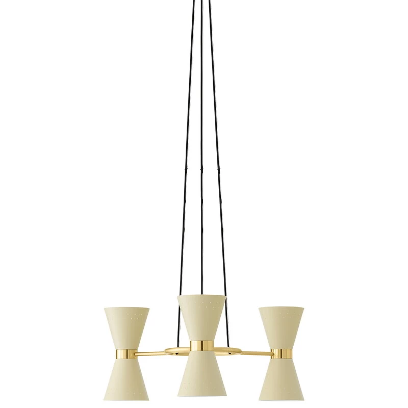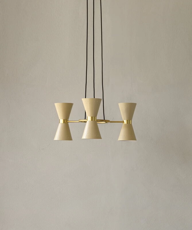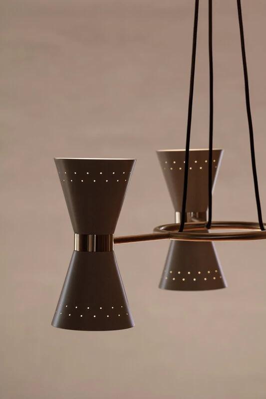 Menu’s Collector 3 chandelier brings soft light and an intimate atmosphere to homes and public places. The timelessly modern pendant consists of six conical aluminium shades that have small holes in them. The light shines both upwards and downwards at the same time, as well as through tiny, perforated holes, beautifully filtering the light. Luxurious brass detailing crowns the delicate look of the luminaire and, as it patinates over time, only adds to the elegance of the Collector’s appearance.