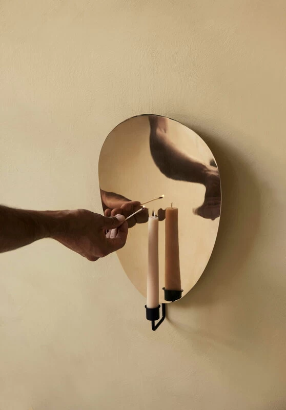 Designed by Krøyer-Sætter-Lassen, the wall sconce comprises a black-painted steel base and a backplate in polished brass, which guides, reflects and magnifies the candle’s light – and catches the eye even when the candle is not lit. The distinctive, delightfully abstract backplate gives Flambeau, “torch”, an elegant yet playful look, making it a captivating addition to any interior.
