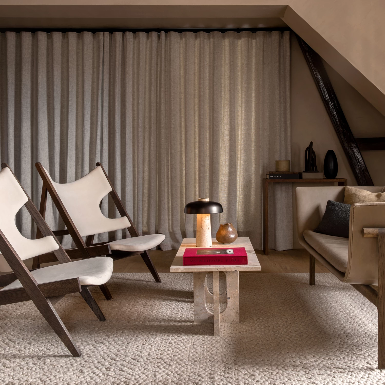 The Reverse Table Lamp design was inspired by 1970s Italian marble tables and the beauty of natural materials. Unworked stone and bronzed aluminium create intriguing light and shadow effects. Adjust the light intensity of the Reverse Lamp to fill spaces with characterful warm light.